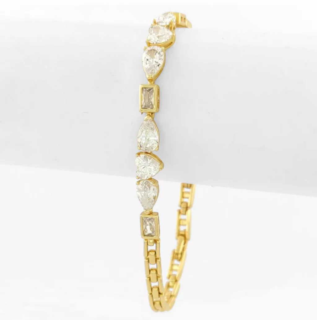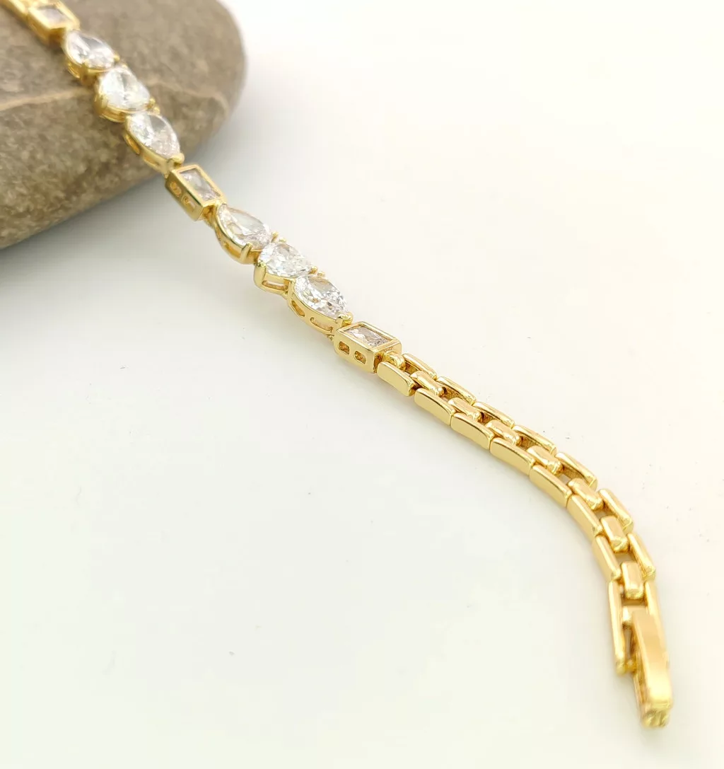 Aranysárga színű karkötő, melyet fehér cirkónia kristályok tesznek csillogóvá.