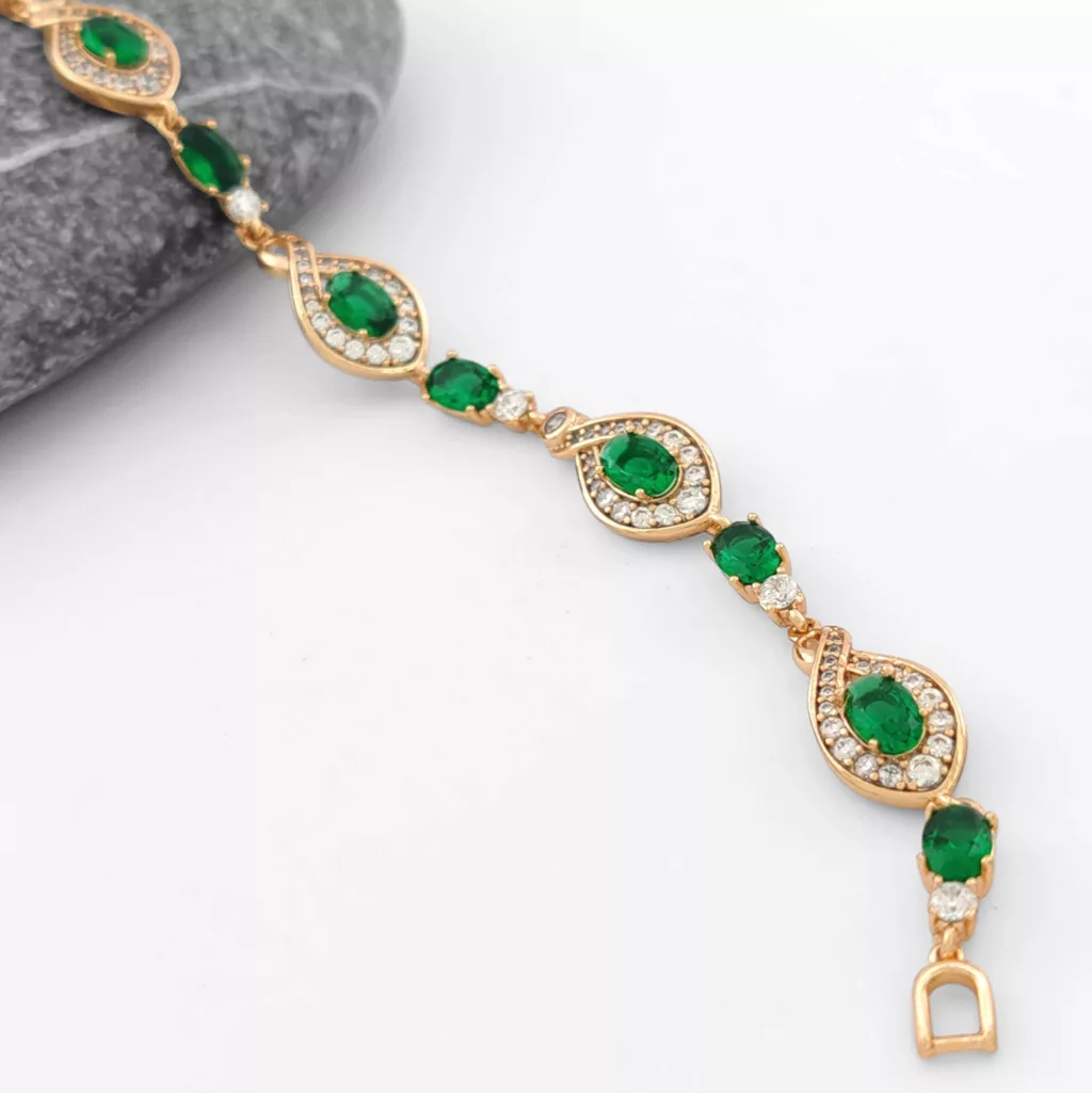 Aranyszínű karkötő, melyet smaragdzöld és fehér cirkónia kristályok tesznek csillogóvá.