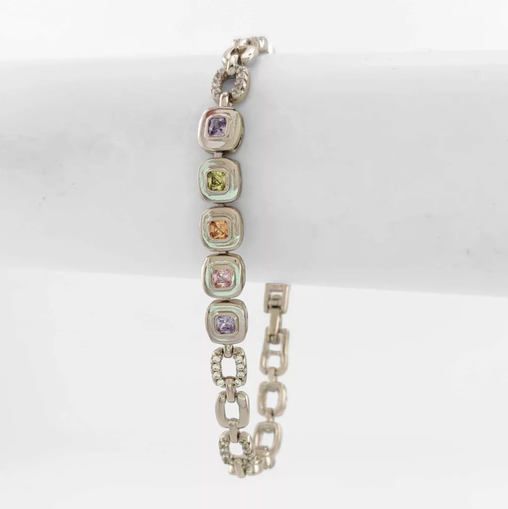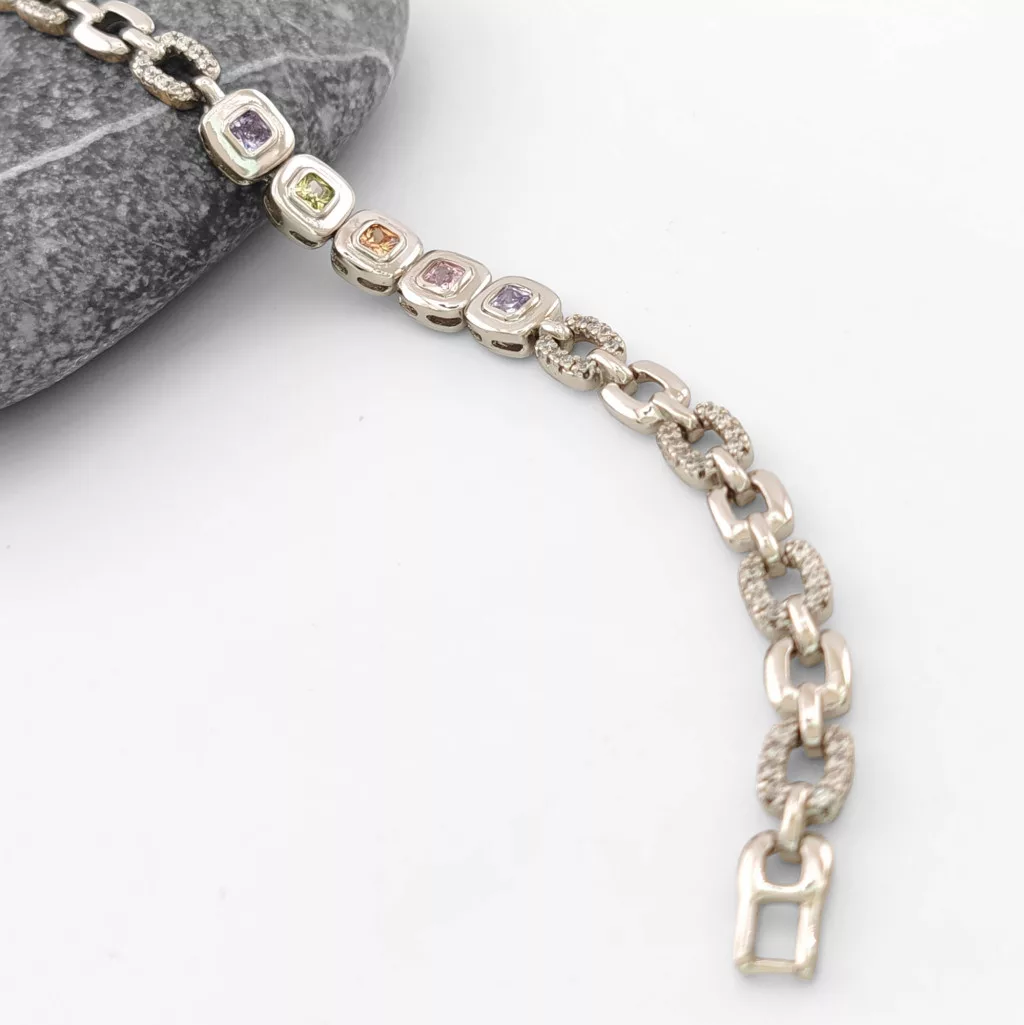Ezüstszínű karkötő, melyet színes és fehér cirkónia kristályok tesznek csillogóvá.