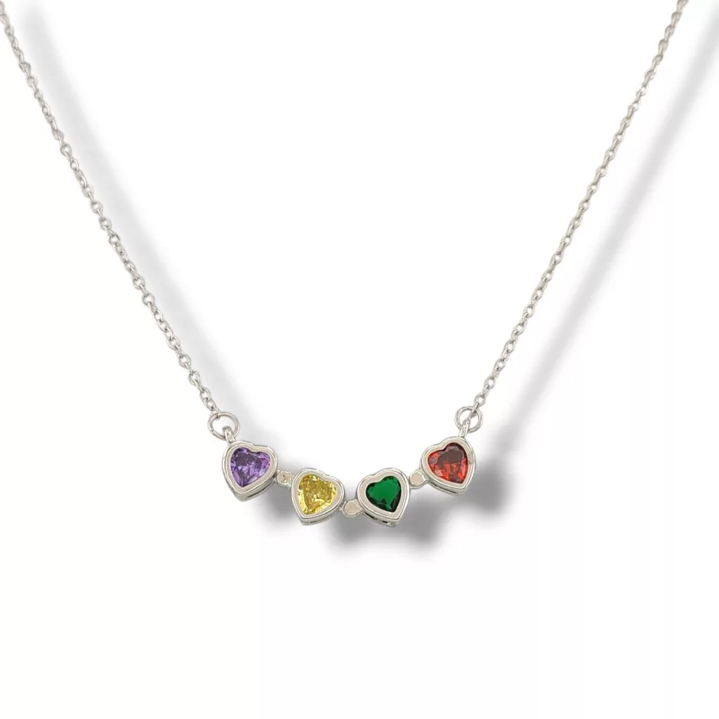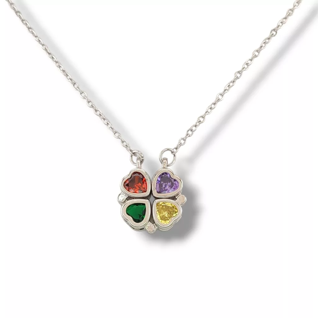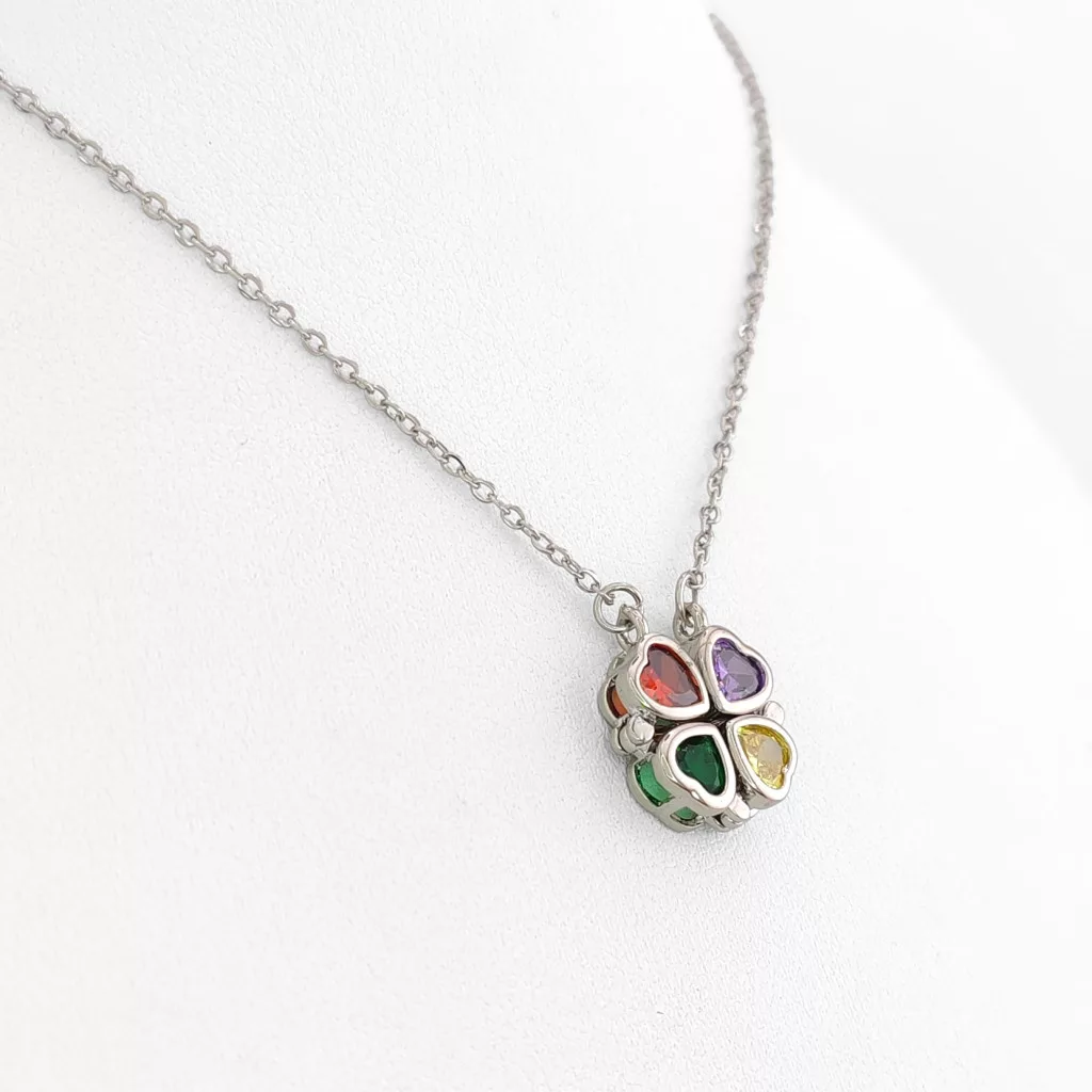 Ezüstszínű nemesacél ( 316L ) nyaklánc, nemesacél ( 316L ) különleges medállal, melyet csillogó smaragdzöld, piros, napsárga és lila cirkónia kristályok díszítenek.