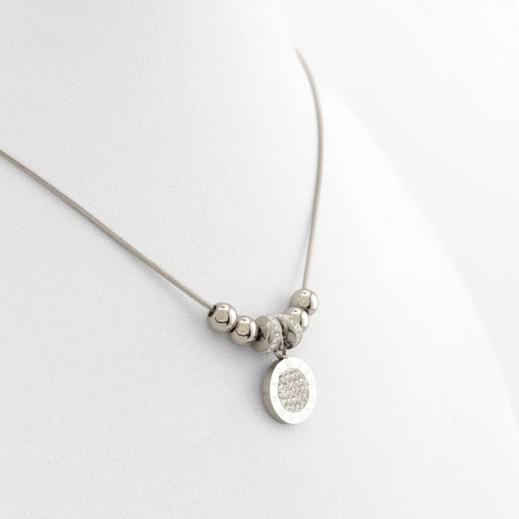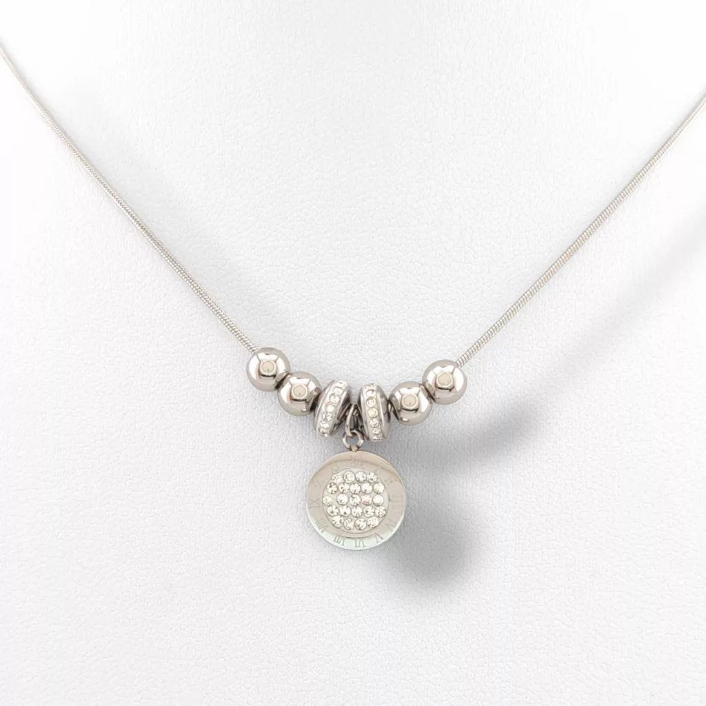 Ezüstszínű nemesacél ( 316L ) nyaklánc medállal, melyet fehér cirkónia kristályok és nemesacél gömbök díszítenek díszítenek.