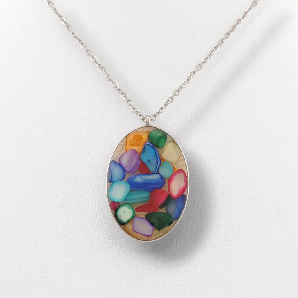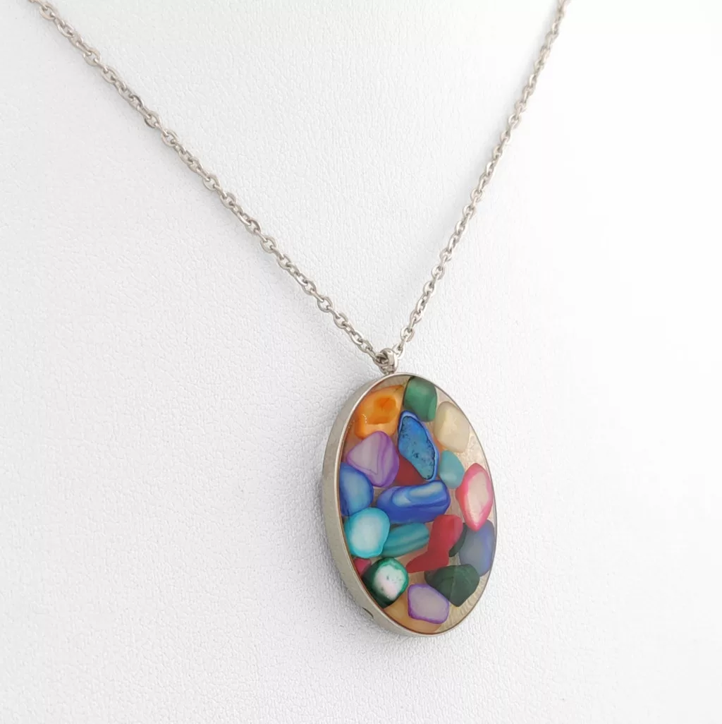Ezüstszínű nemesacél ( 316L ) nyaklánc, színes lencse medállal.