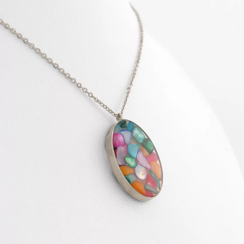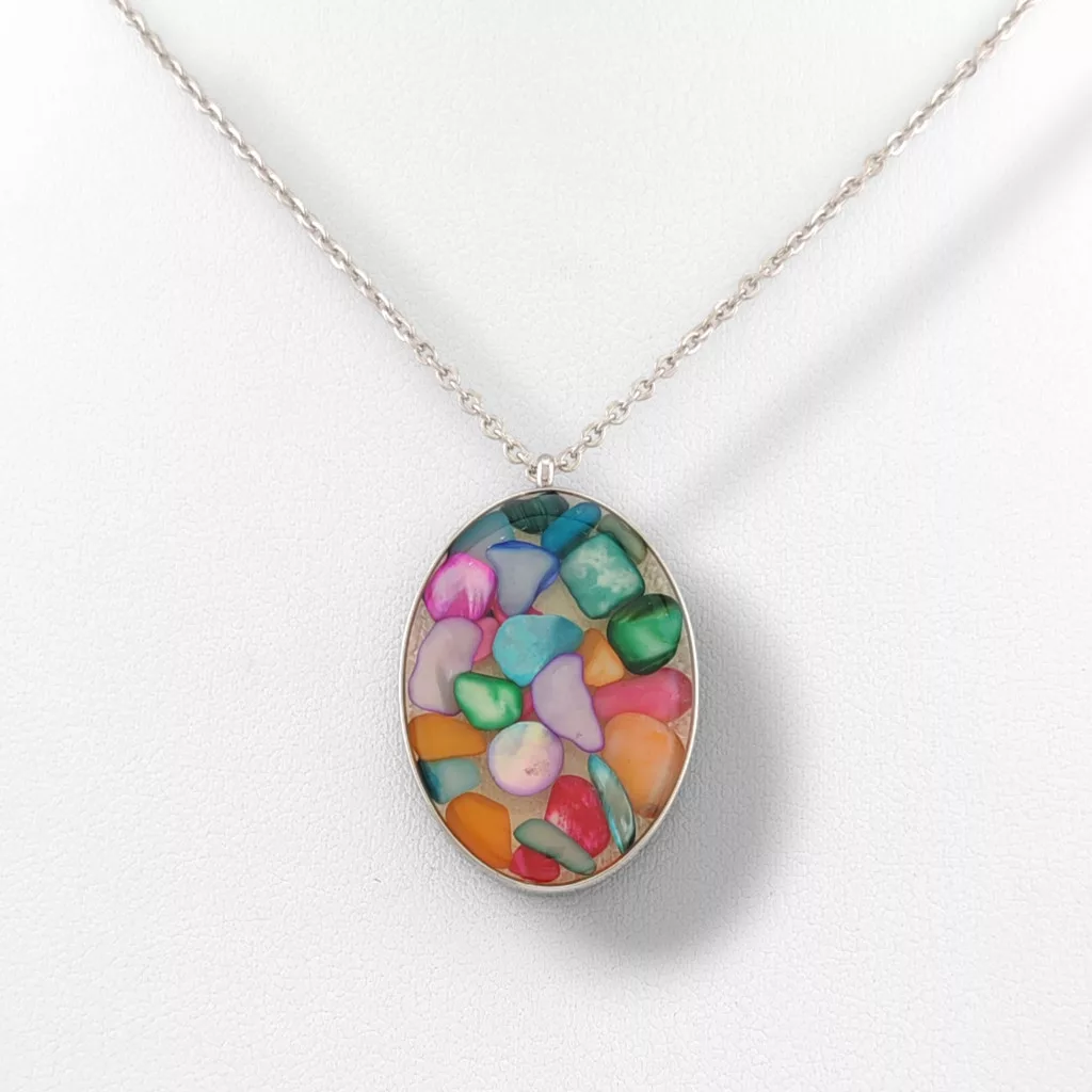 Ezüstszínű nemesacél ( 316L ) nyaklánc, színes lencse medállal.