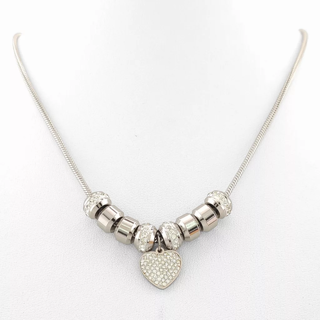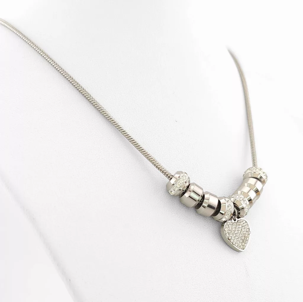 Ezüstszínű nemesacél ( 316L ) kígyólánc, csillogó fehér cikrónia kristályos szív medállal és charmokkal.
