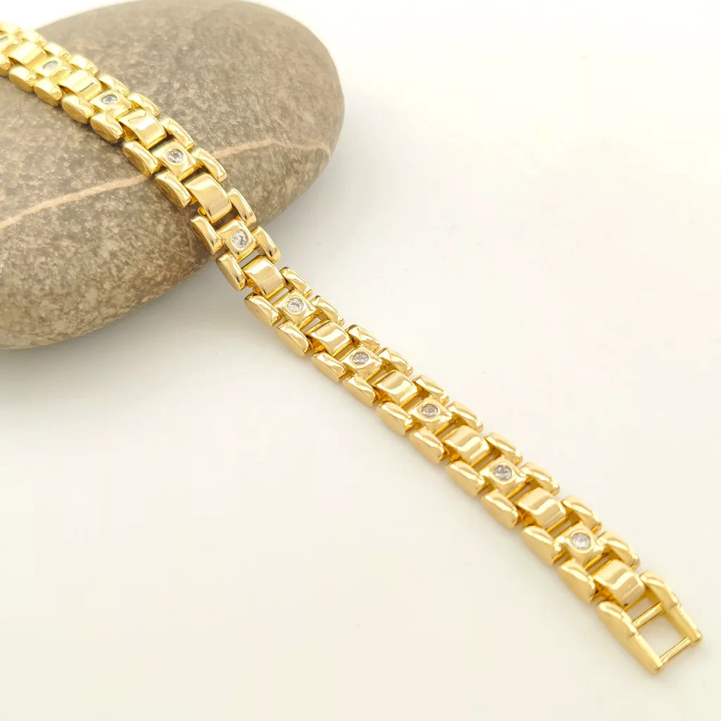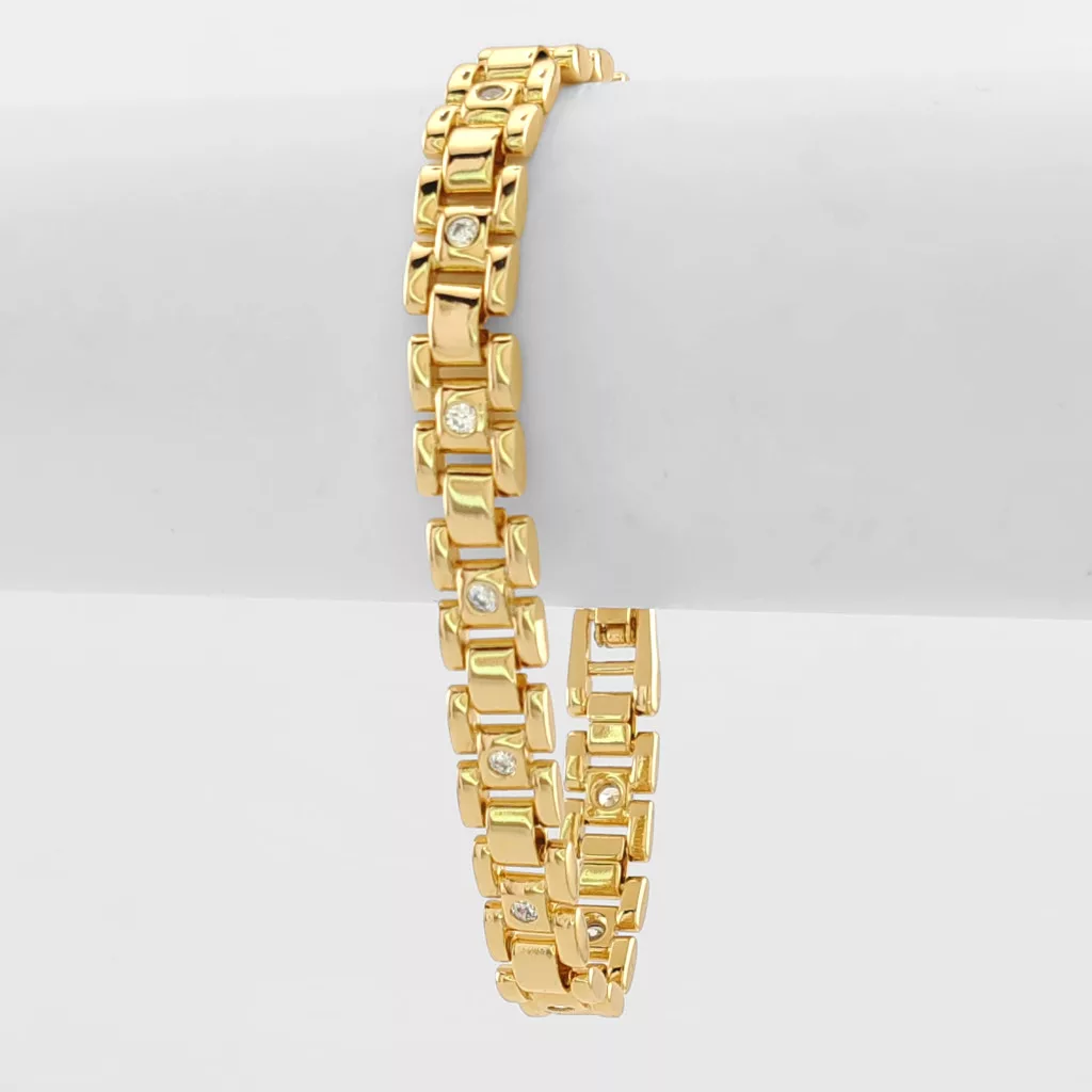 Aranysárga színű karkötő, melyet fehér cirkónia kristályok tesznek csillogóvá.
