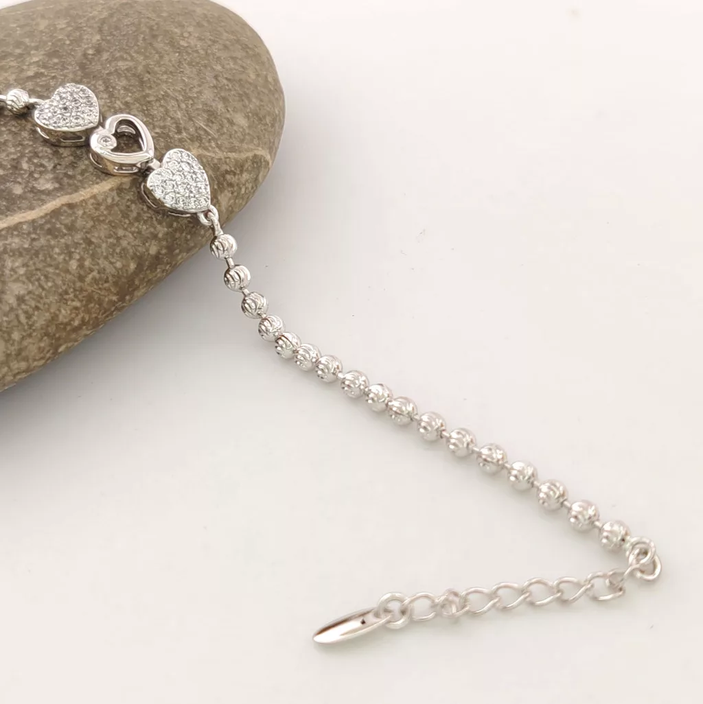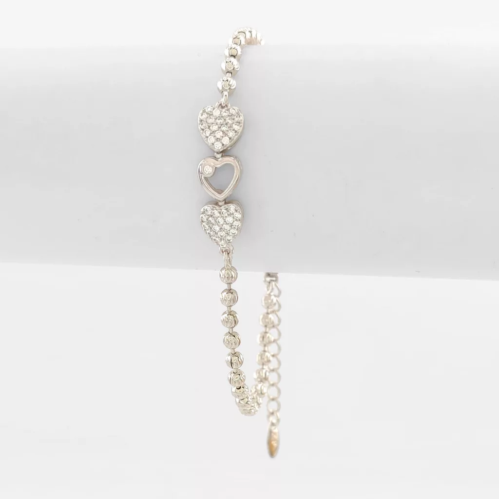 Ezüstszínű karkötő, melyet fehér cirkónia kristályok tesznek csillogóvá és szív motívumok díszítenek.