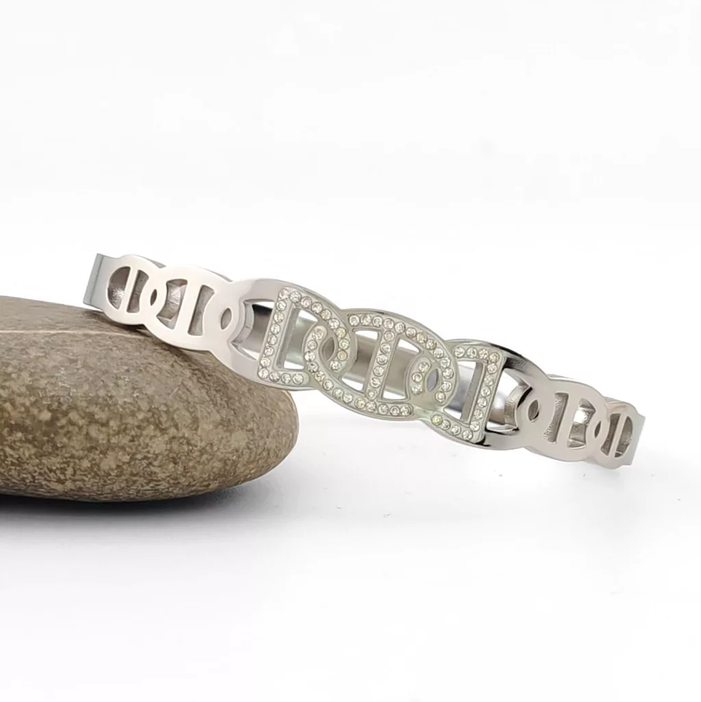Ezüstszínű nemesacél (316L) karperec, melyet csillogó fehér cirkónia kristályok díszítenek.