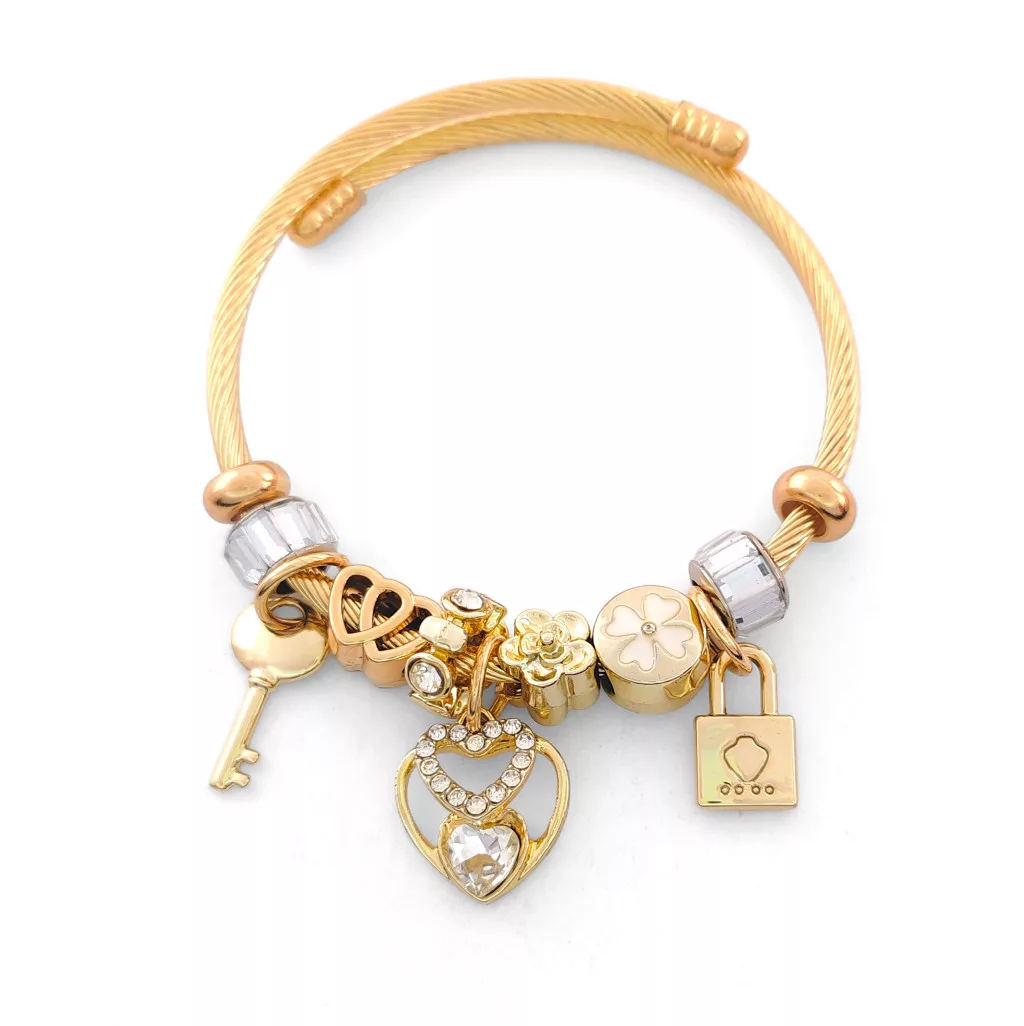 Aranyszínű nemesacél pandora jellegű karperec szív, lakat és kulcs charmokkal