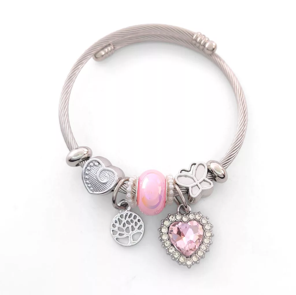 Ezüstszínű nemesacél pandora jellegű karperec életfa és szív charmokkal