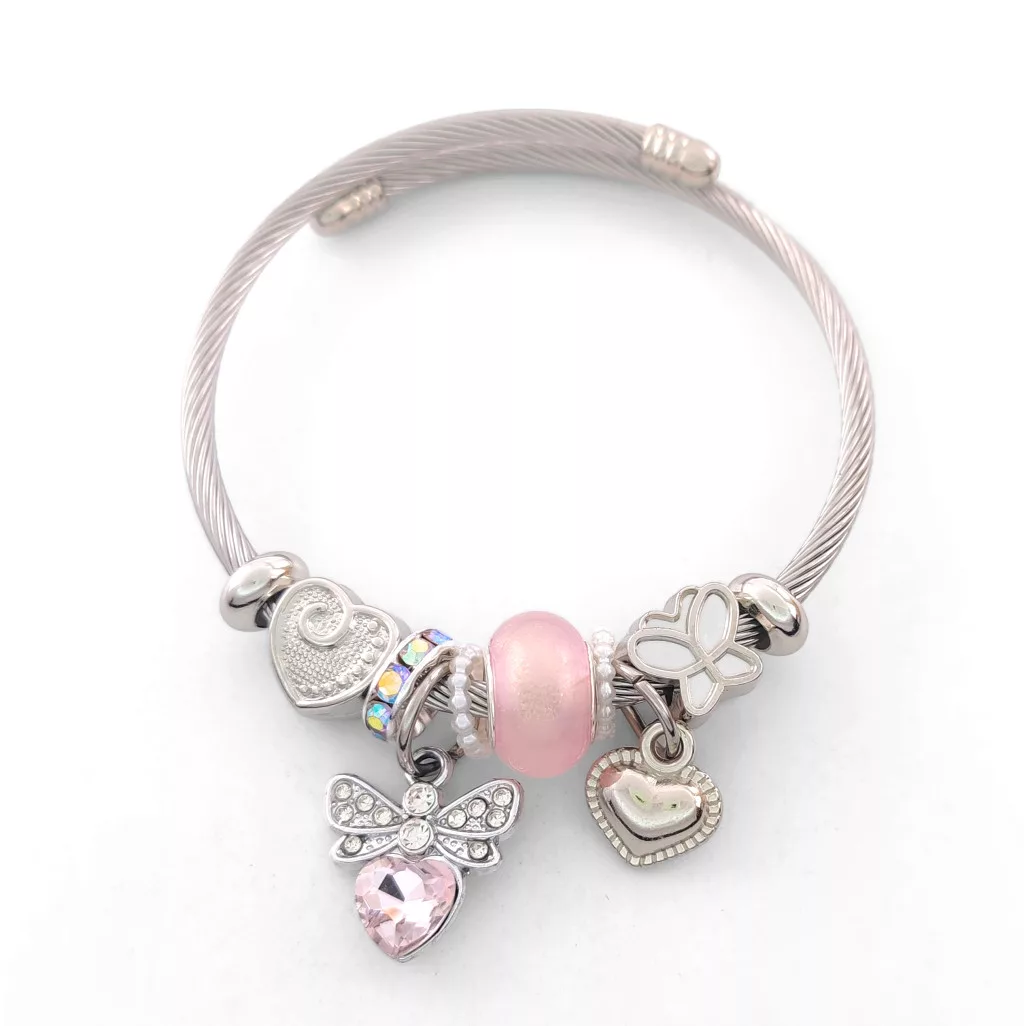 Ezüstszínű nemesacél ( 316L ) pandora jellegű karperec, melyet szív és pillangó charmok, rózsaszín és fehér kristályok, gyöngyök díszítenek.