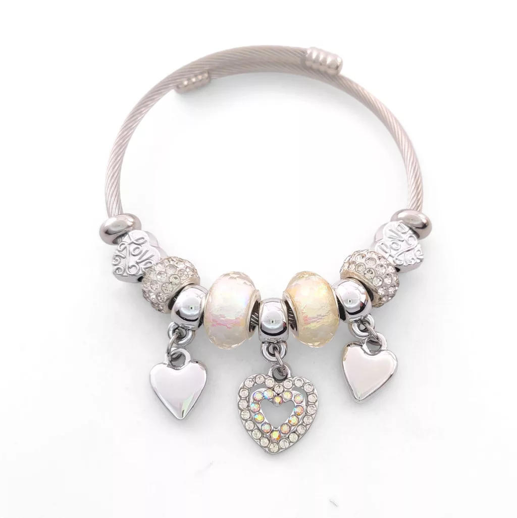 Ezüstszínű nemesacél pandora jellegű karperec szív charmokkal