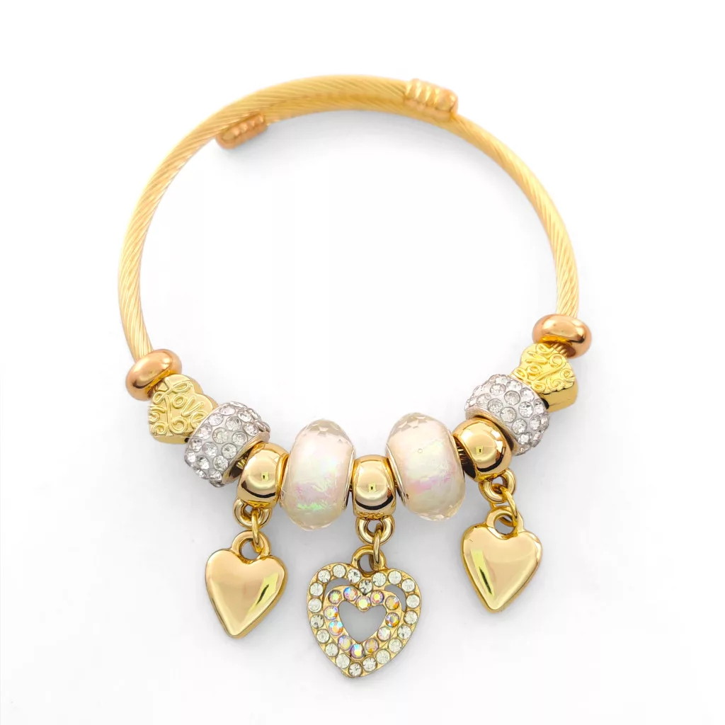 Aranyszínű nemesacél pandora jellegű karperec szív charmokkal