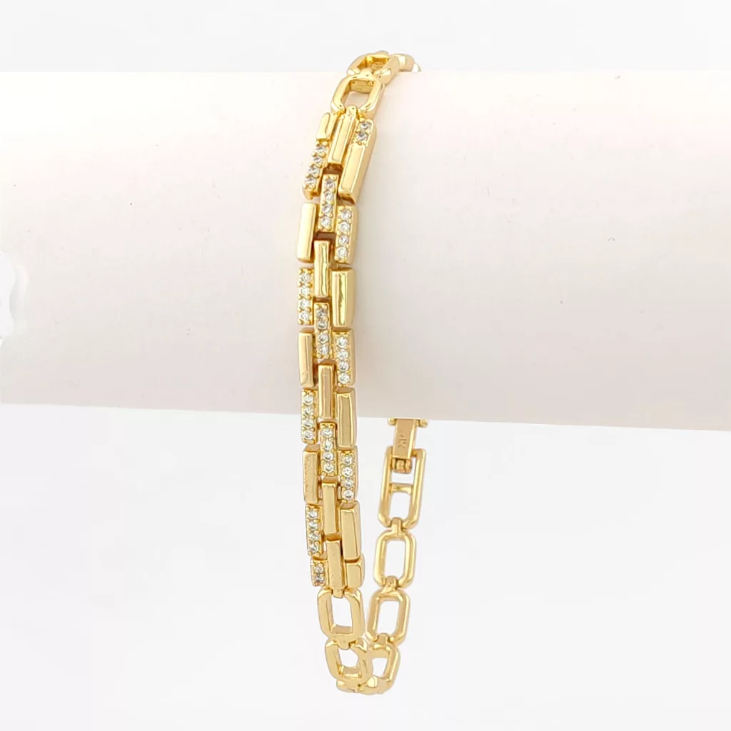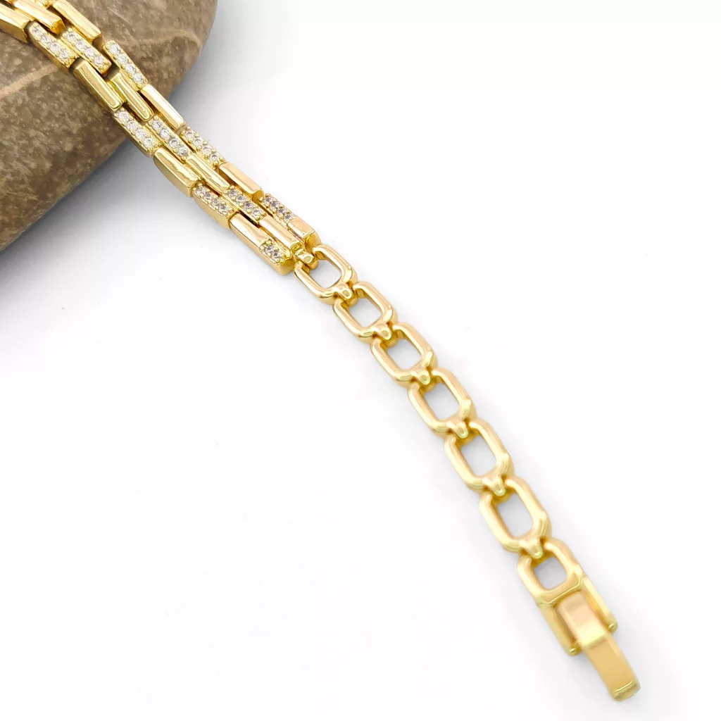 Aranysárga színű karkötő, melyet fehér cirkónia kristályok tesznek csillogóvá.