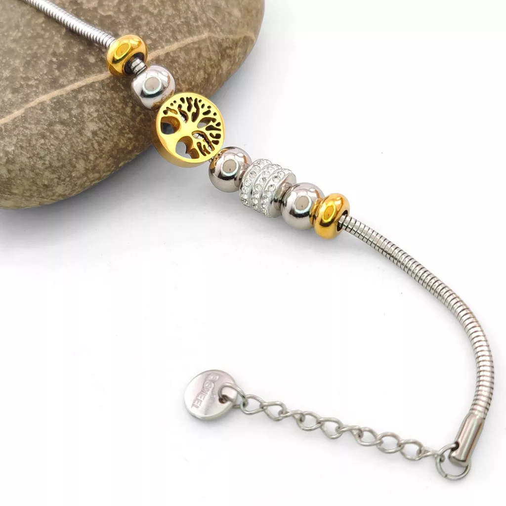 Arany-ezüstszínű nemesacél ( 316L ) pandora jellegű karkötő, melyet életfa charm díszít és fehér cirkónia kristályok tesznek csillogóvá.
