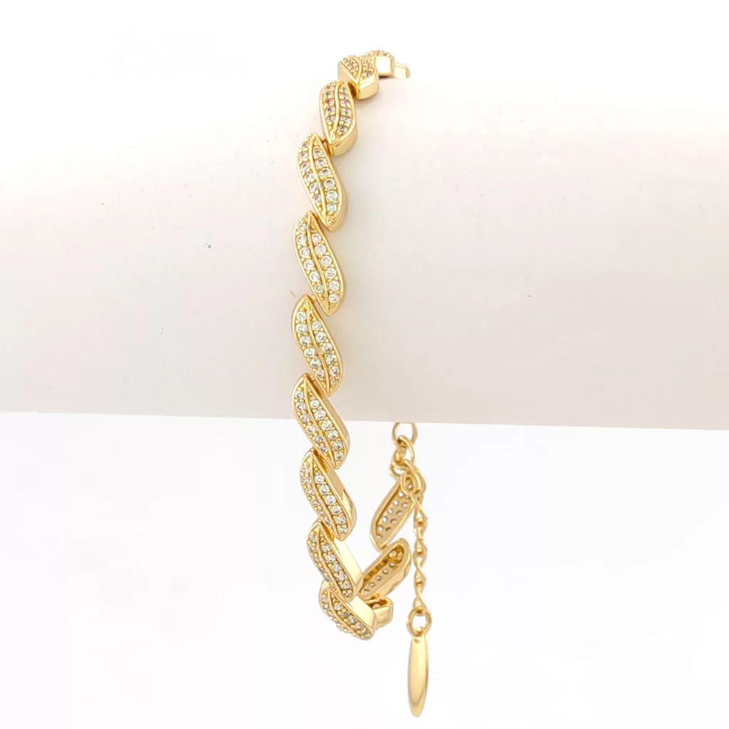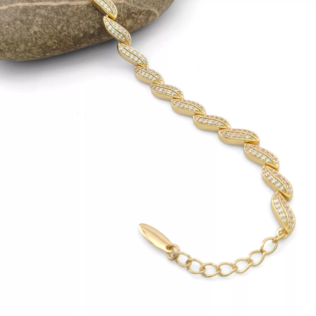 Aranysárga színű karkötő, melyet fehér cirkónia kristályok tesznek csillogóvá.