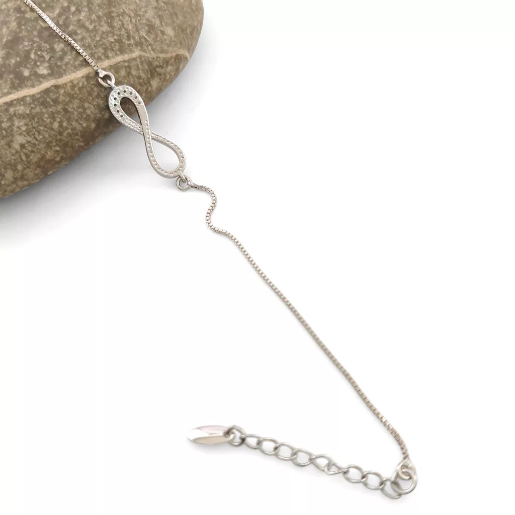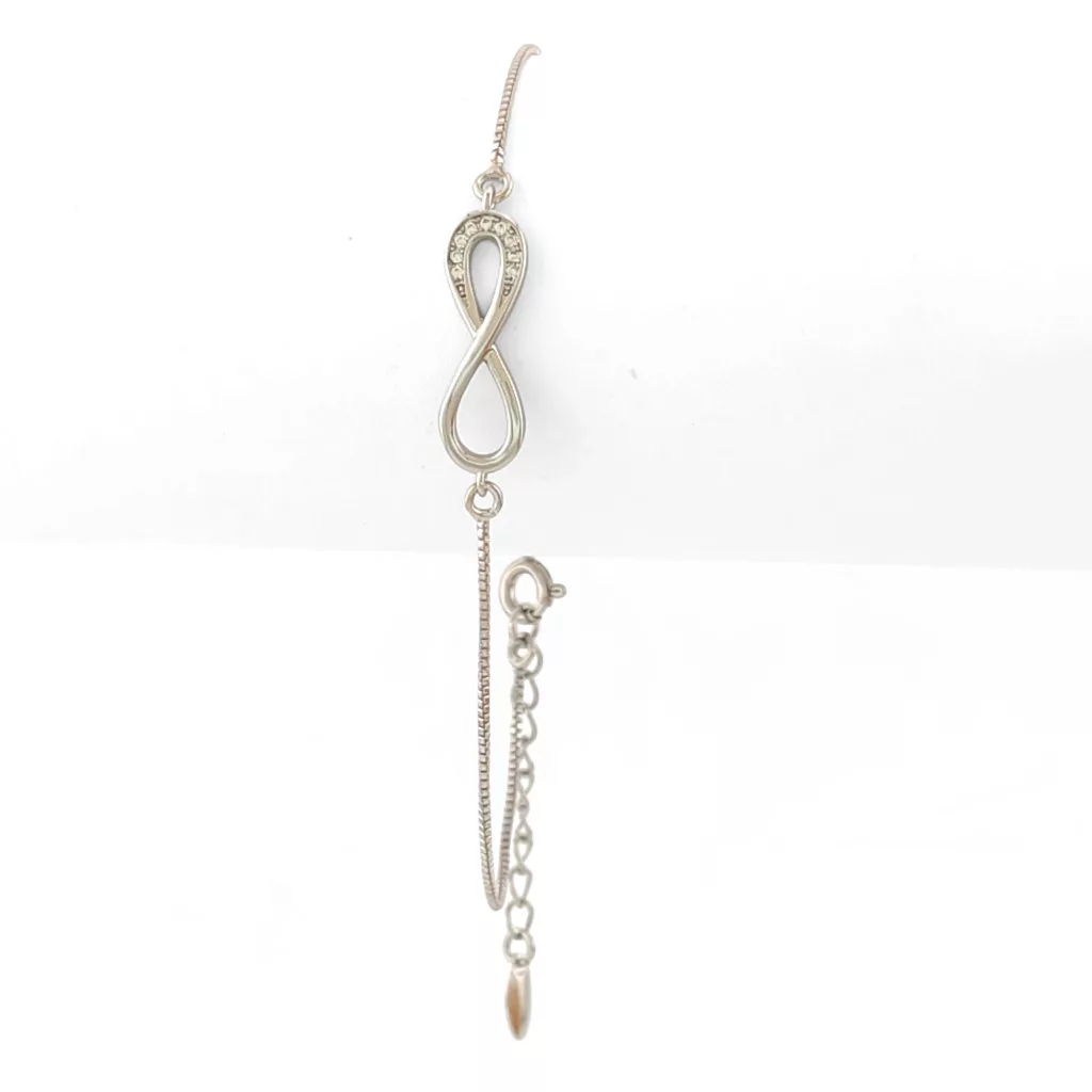 Ezüstszínű karkötő, melyet fehér cirkónia kristályok tesznek csillogóvá és végtelen jel motívum díszít.