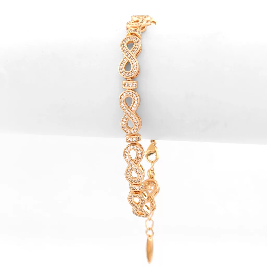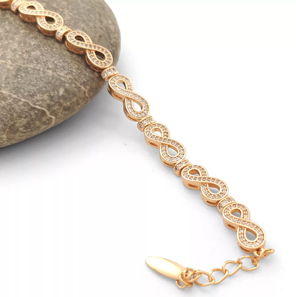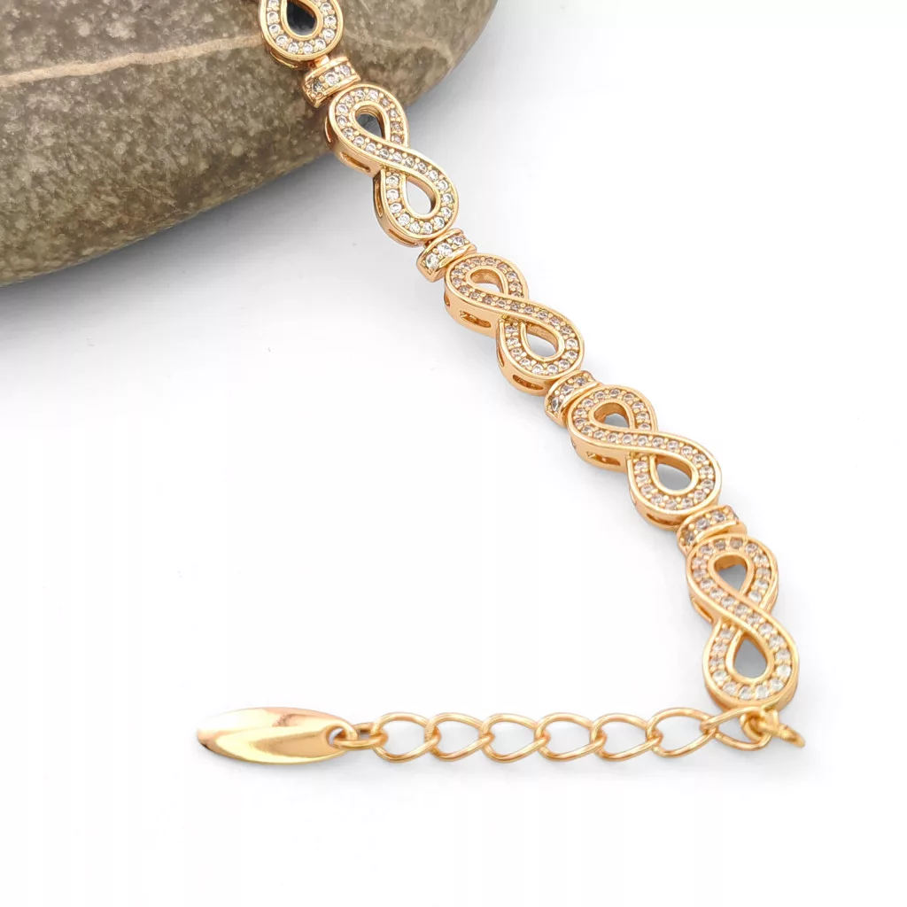 Aranyszínű végtelen jelet formázó szemekből kialakított karkötő, melyet fehér cirkónia kristályok tesznek csillogóvá.