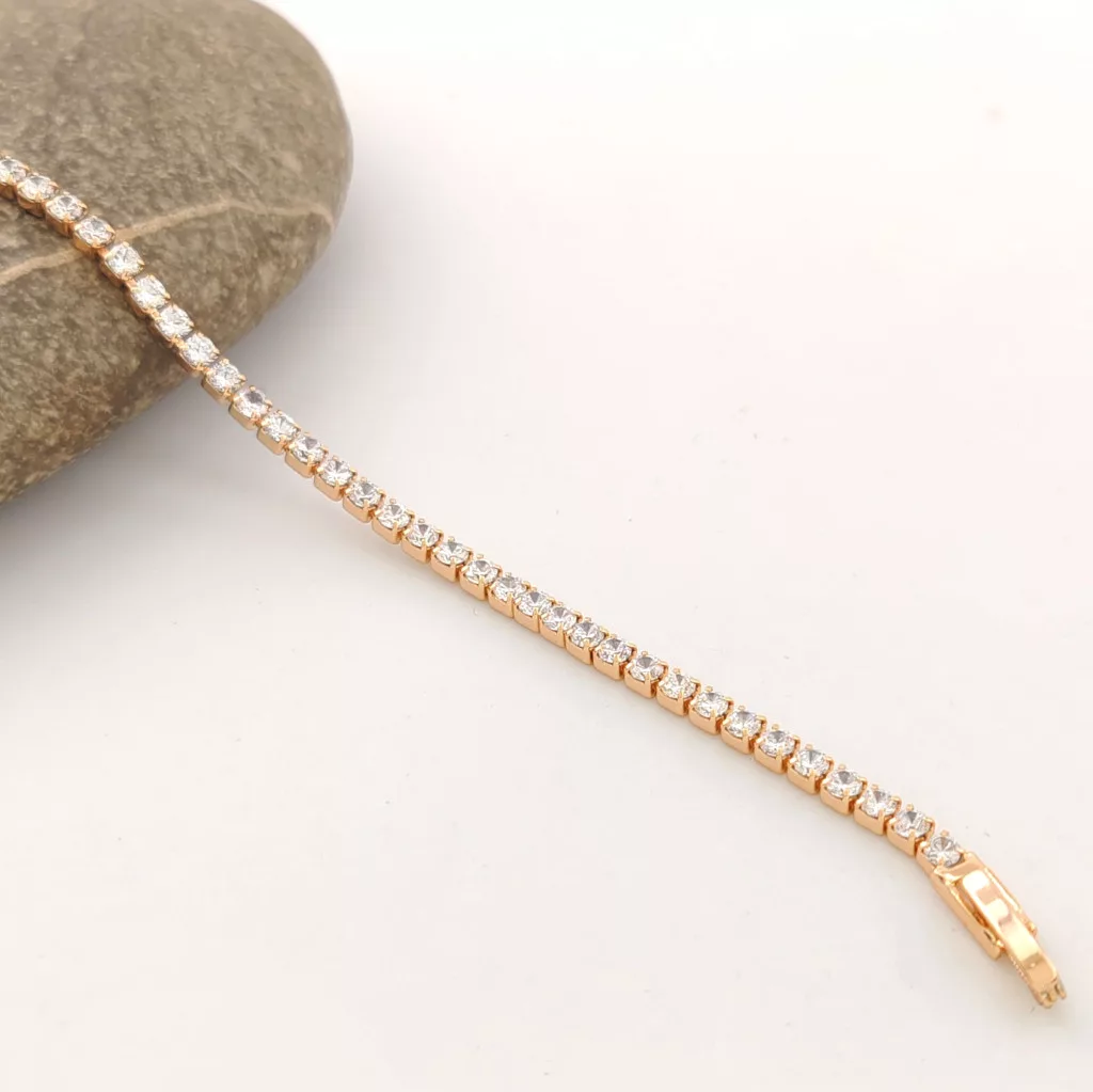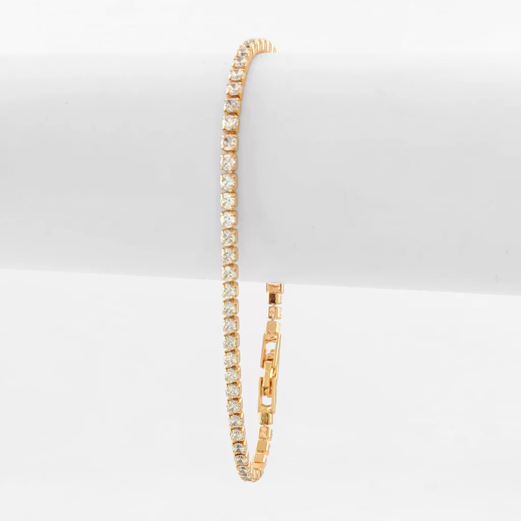 Aranyszínű, vékony karkötő, melyet fehér cirkónia kristályok tesznek csillogóvá.