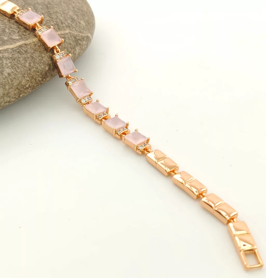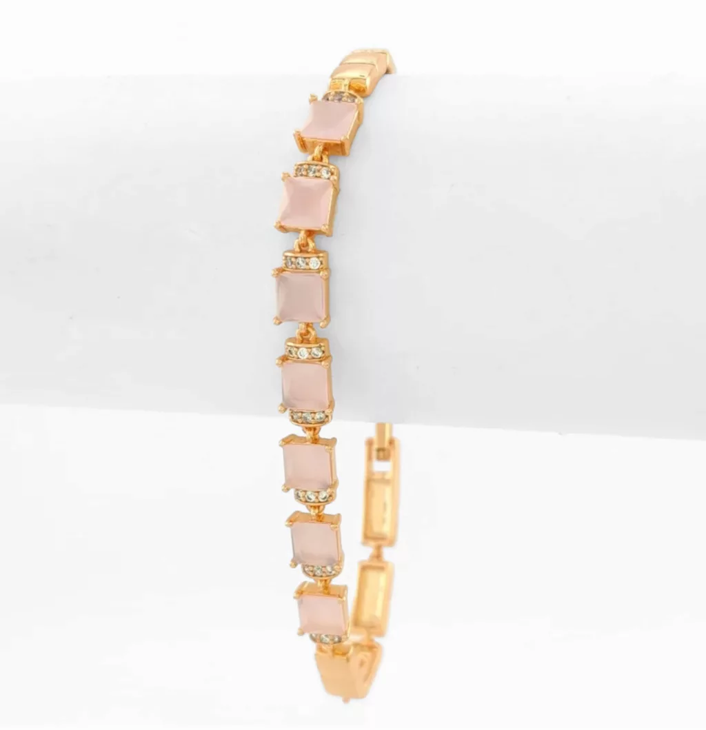 Aranyszínű karkötő, melyet opálos rózsaszín és fehér cirkónia kristályok tesznek csillogóvá.