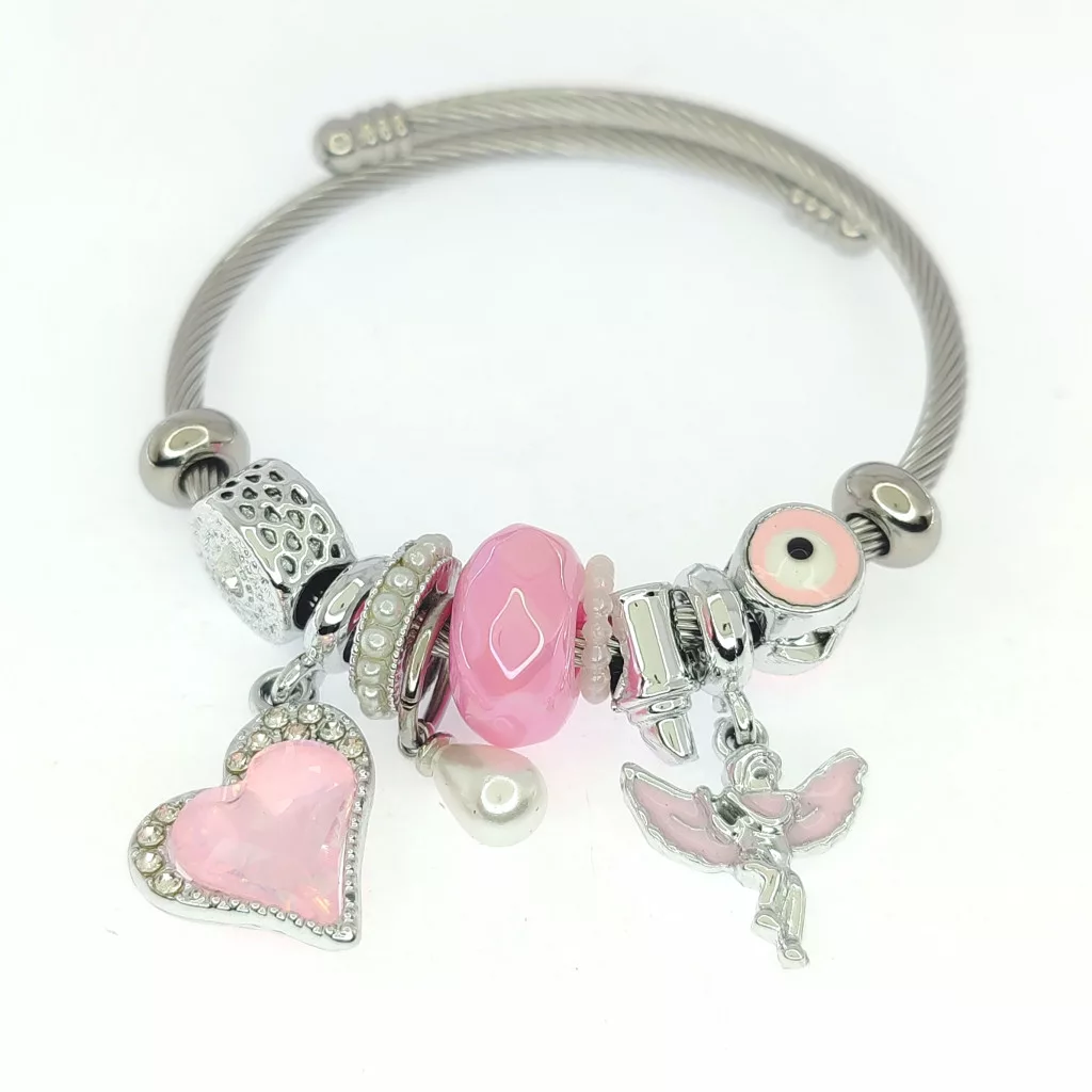 Ezüstszínű nemesacél pandora jellegű karperec szív és angyalka charmokkal